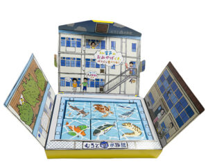 また、枕投げでたまに飛んでくるアイテム「廃校水図鑑」も、提供いただいたお菓子です。